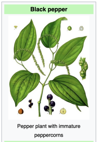 Black pepper is native to the Malabar Coast of India,[3][4] and the Malabar pepper is extensively cultivated there and in other tropical regions. Ground, dried, and cooked peppercorns have been used since antiquity, both for flavour and as a traditional medicine. Black pepper is the world’s most traded spice,[5] and is one of the most common spices added to cuisines around the world. Its spiciness is due to the chemical compound piperine, which is a different kind of spiciness from that of capsaicin characteristic of chili peppers. It is ubiquitous in the Western world as a seasoning, and is often paired with salt and available on dining tables in shakers or mills.